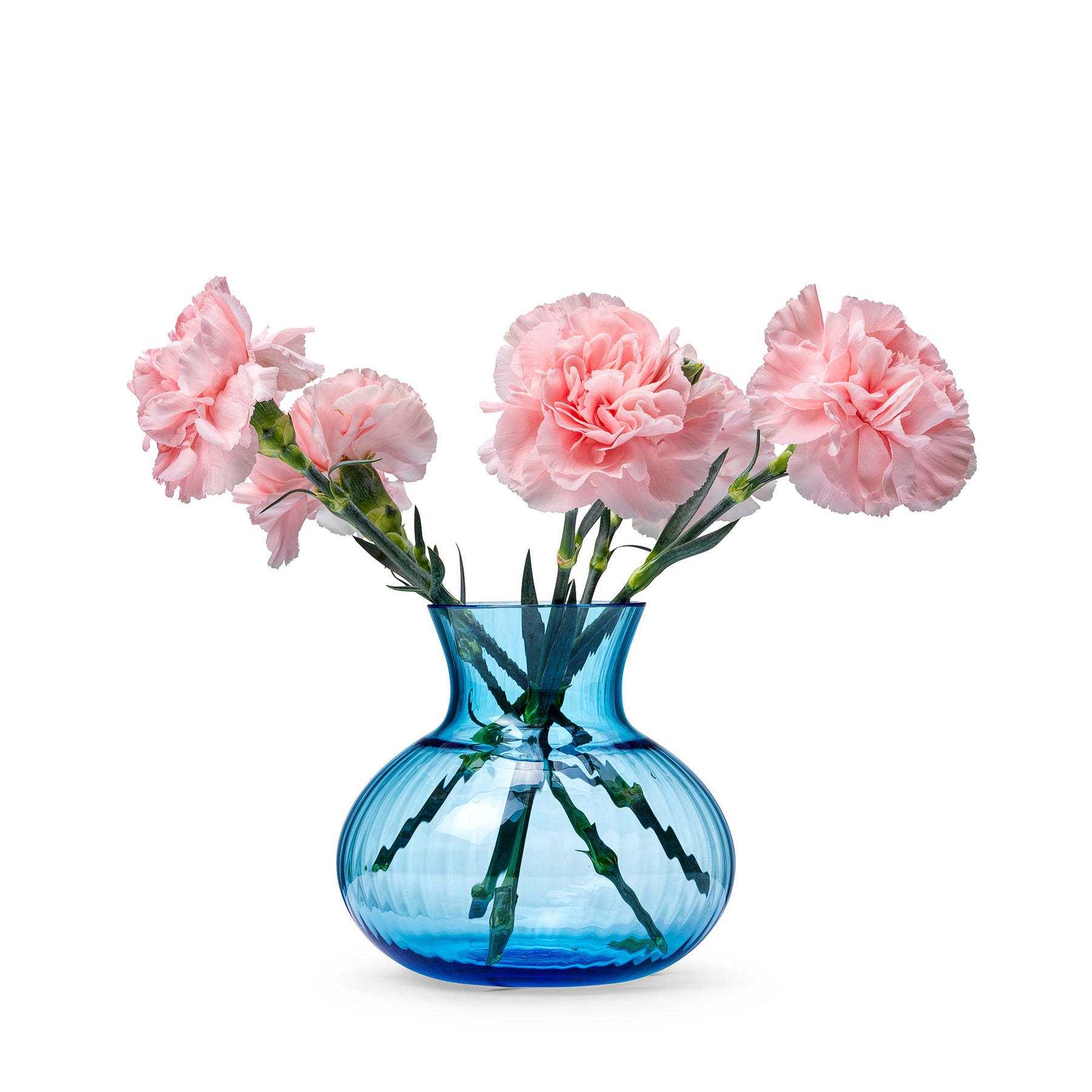 Beautiful handmade In Flore Catherine vase, small, in a light blue color. Our Catherine vase is handmade in glass with characteristics of sparkling clarity and brilliance. All vases are handmade and therefore unique in color and appearance giving you a signature collectable piece.